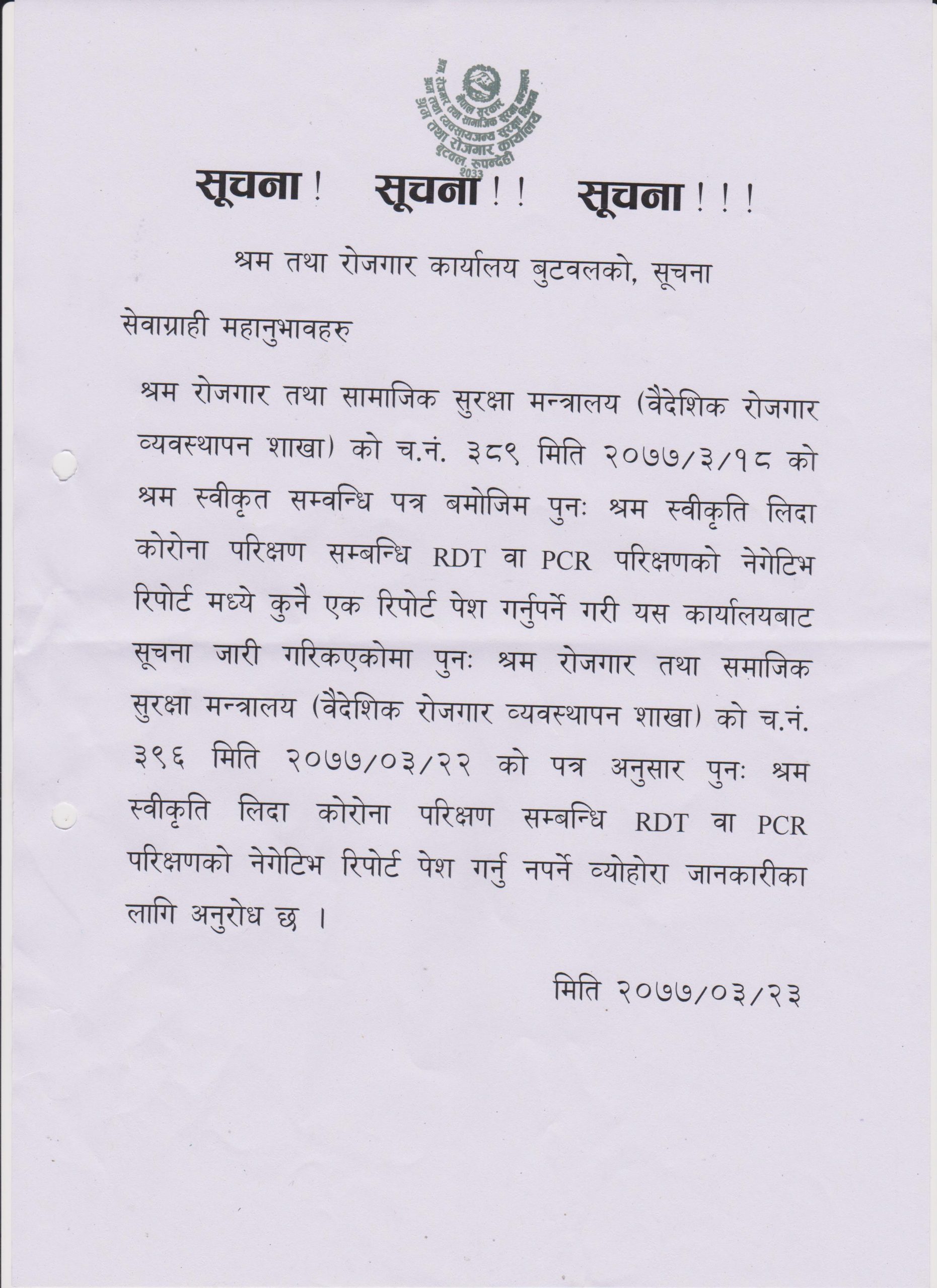 पुन: श्रम स्वीकृतिकाे सम्बन्धमा श्रम तथा राेजगार कार्यालय,बुटवलकाे सूचना